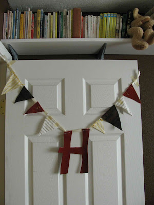 Pennant garlands are so in right now! I see them everywhere I turn in blog-land. Howie has been relentlessly begging me for one – a monogrammed one, no less – to hang on his bedroom door. So, for his 4-month birthday, I made him one. And had so much fun; this is definitely the stuff of relaxation to me! Here are some pictures that document my process, in case you feel so compelled to join the trend.
